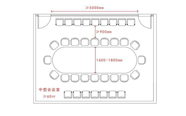 6.4.4 中型會議室面積不宜小于60㎡、可供15~50人會議;中型會議室的會議桌桌面尺寸為1.6m~1.8m;桌子高度0.75m~0.8m;如該辦公室位于高層建筑的內(nèi),依據(jù)《高層民用建筑設計防火規(guī)范》規(guī)定,達到60平方的獨立開間需設計兩個以上的安全疏散出口,其相鄰兩個安全出口最近邊緣的水平距離不應小于5m。
