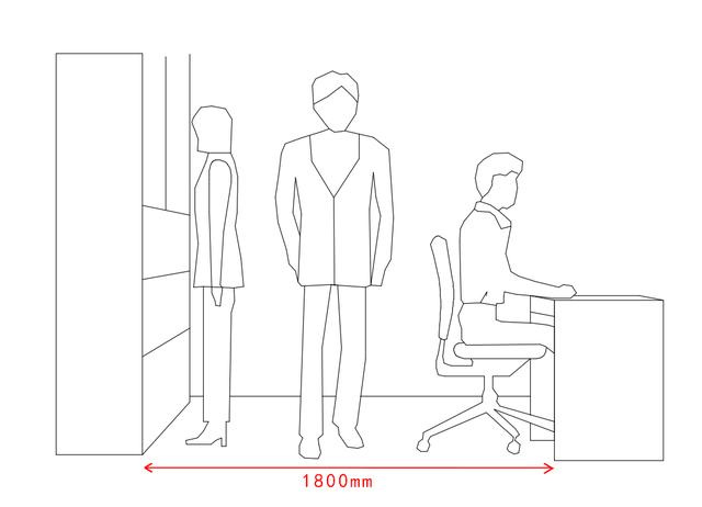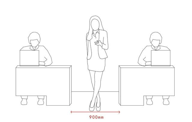 6.2.1 辦公室的通道尺寸不應少于0.9m,滿足兩個人正面和側面同時通過。